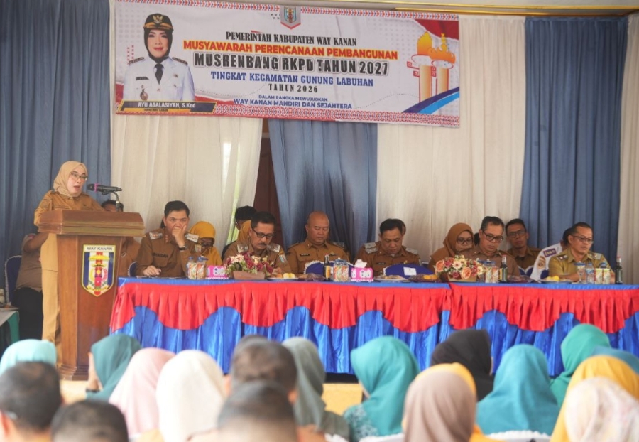 Way Kanan – Bupati Way Kanan, Ayu Asalasiyah, S.Ked., membuka Musyawarah Perencanaan Pembangunan (Musrenbang) Tahun 2026 Tingkat Kecamatan Gunung Labuhan, Senin (09/02/2026), di Aula Kecamatan Gunung Labuhan.